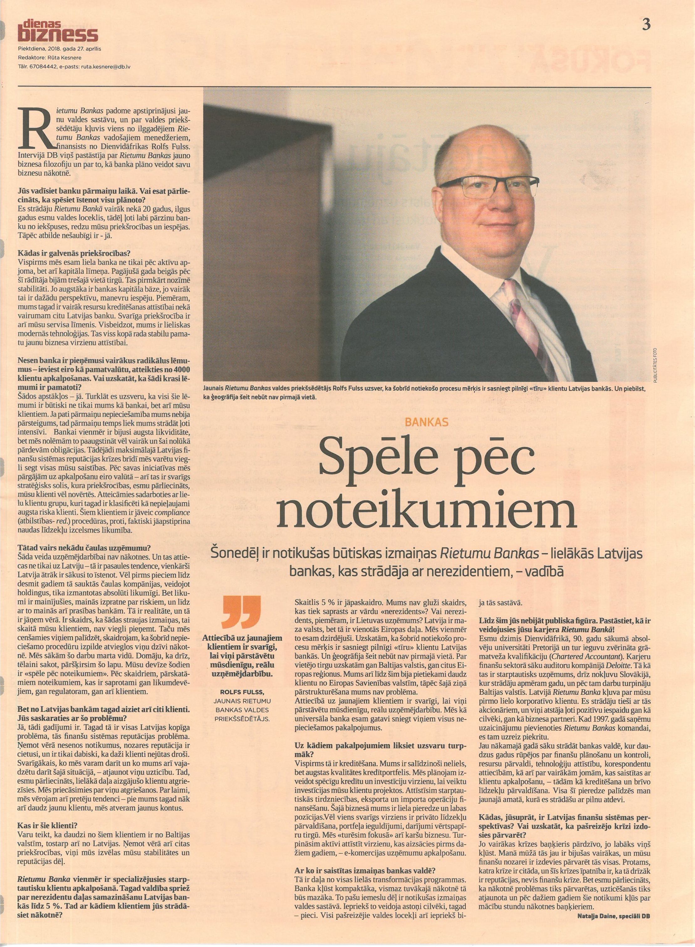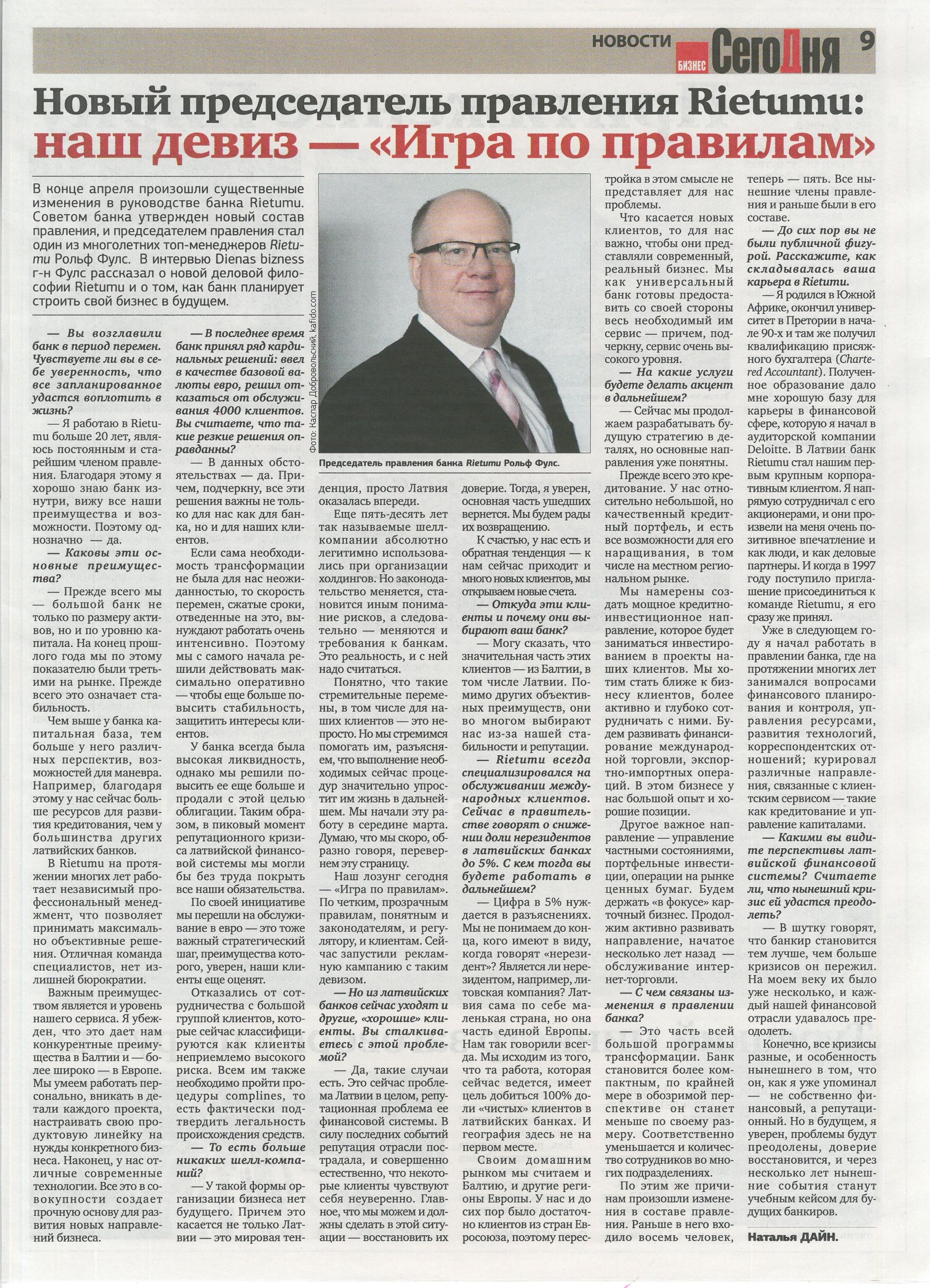 «Segodna» («Сегодня») have published an interview with Rietumu Bank’s Chairman of the Board Rolf Fuls.