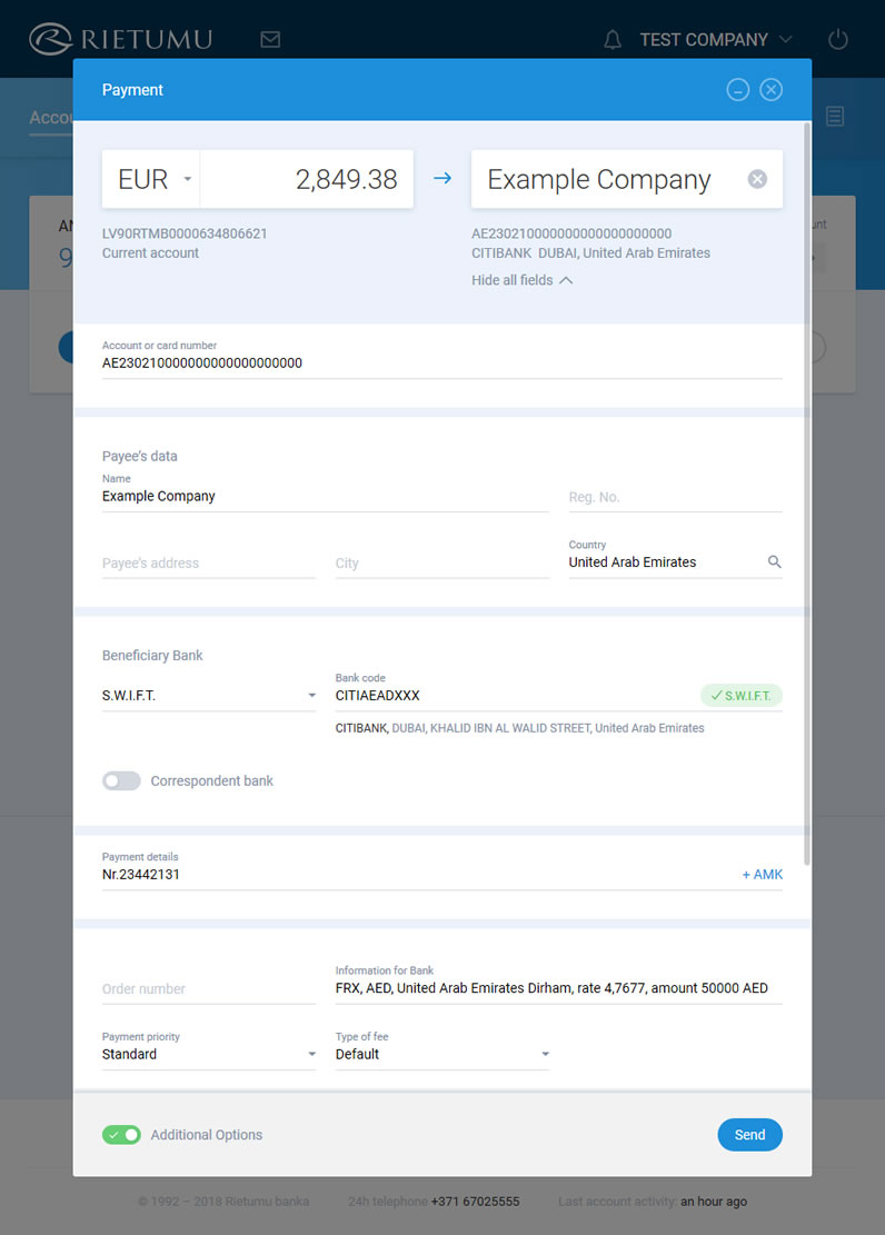 When sending a cross-currency EUR payment, Rietumu Bank’s customer, sender of the payment, submits the payment order to the bank to transfer funds from his current account in EUR. Receiver of the payment gets an appropriate amount in local currency in line with valid exchange rates.