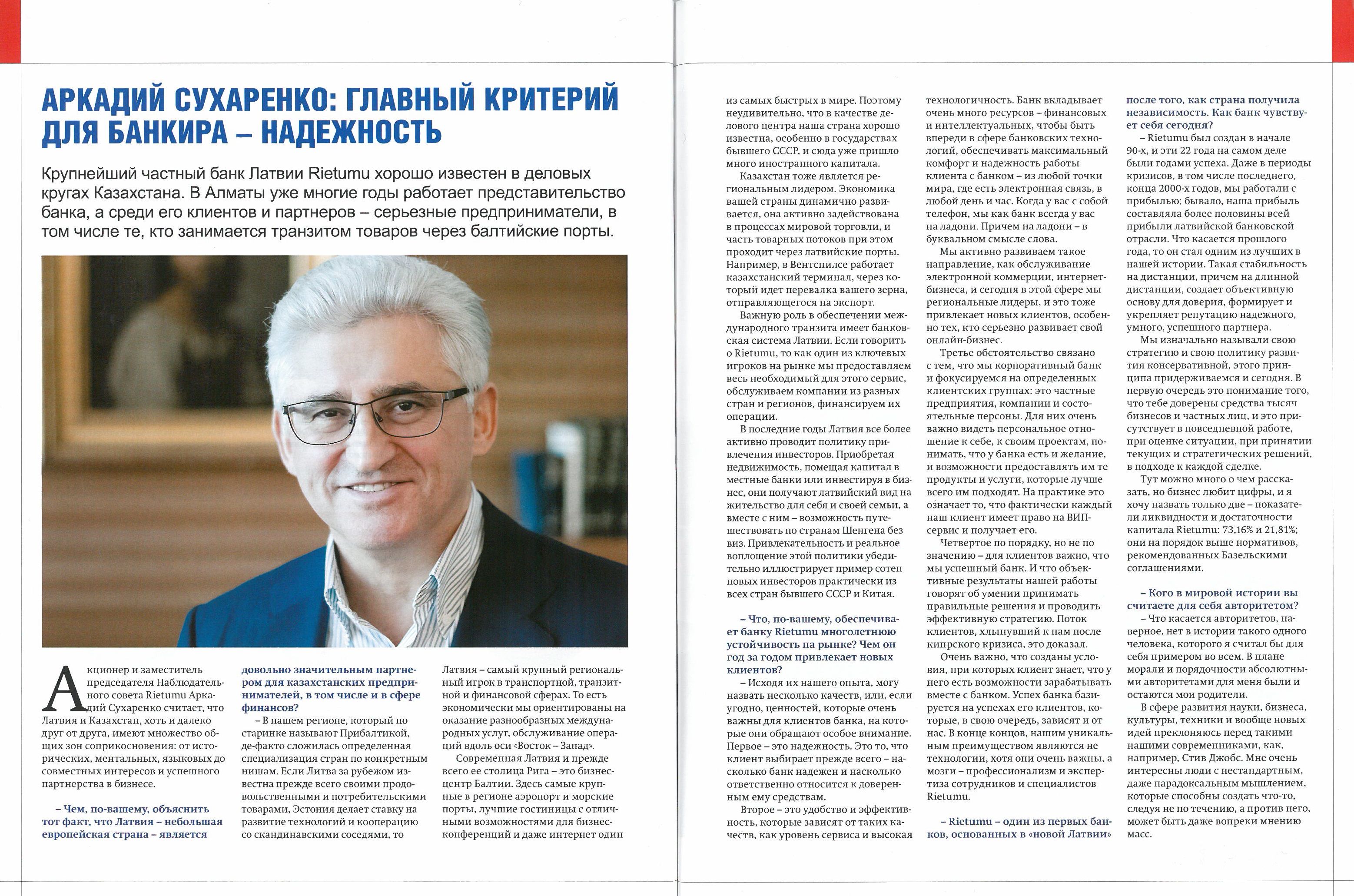 интервью заместителя председателя Совета банка Rietumu Аркадия Сухаренко – об актуальных аспектах сотрудничества между Латвией и Казахстаном; а также о принципах работы, стратегии и политике банка Rietumu, который хорошо известен в деловых кругах этой страны.